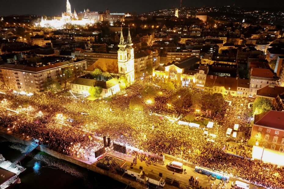 A drone view shows people gathering to celebrate across the River Danube from the Parliament building, following the partial results of the parliamentary election, in Budapest, Hungary, on April 12, 2026.Denes Erdos / AP
