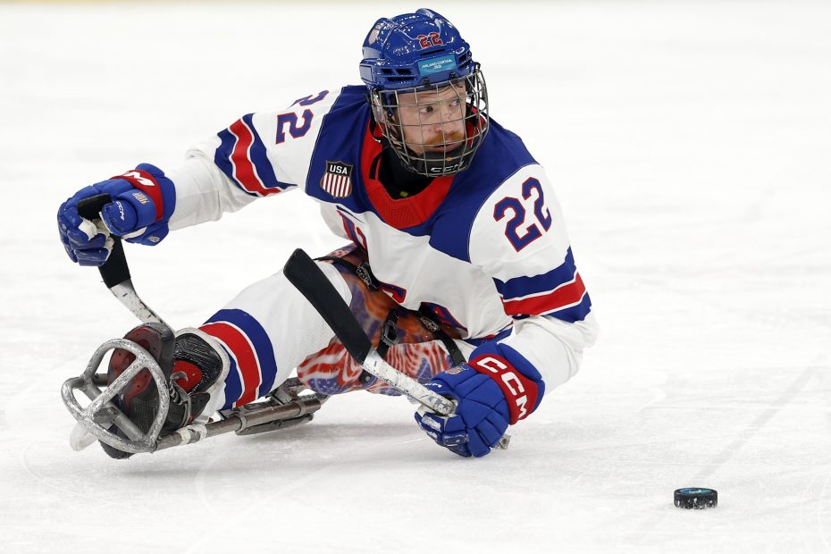 Noah Grove of Team USA skates with the puck during the para ice-hockey preliminary-round match between Team Germany and Team USA on Day 3 of the 2026 Winter Paralympic Games at Milano Santagiulia Ice Hockey Arena.
