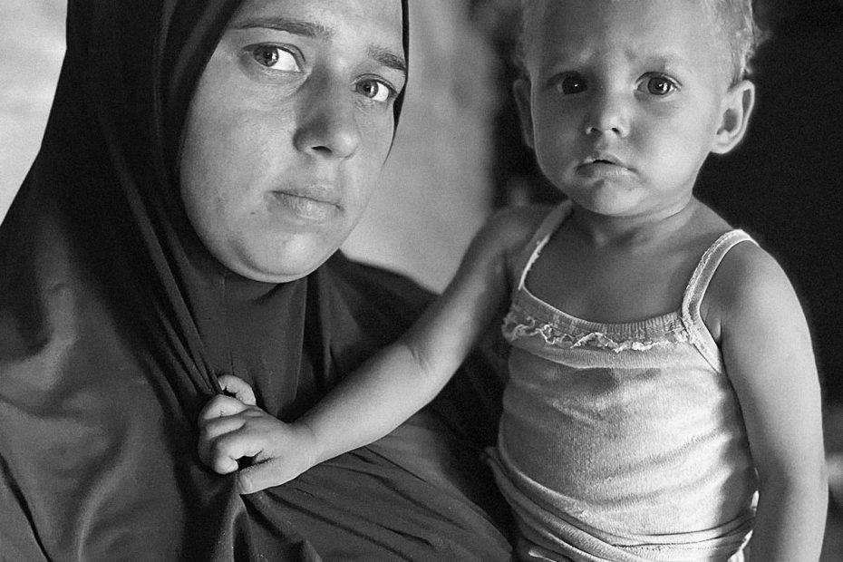 Asala Ferany sat cross-legged inside her tent in a camp near Deir al-Balah, trying to soothe her youngest child. Nada, barely more than a year old, clung to her mother’s neck with tiny, weak arms. The midday heat, nearly 90 degrees Fahrenheit, seeped through the plastic tarp above them. Sweat trickled down Asala’s face, and she had to leave the tent to get some air.